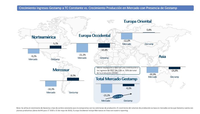 A pesar del entorno desafiante, Gestamp ha batido al mercado en todas sus regiones durante el primer trimestre. En este periodo, el mercado ha reducido sus volúmenes en un -23,2% mientras la facturación del Grupo cayó un -6,1% a tipo de cambio constante.